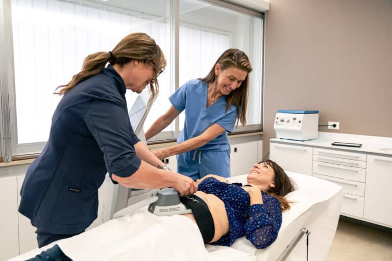 Il paziente si sdraia comodamente mentre l’apparecchiatura viene posizionata sulla zona da trattare. Una seduta dura circa 30 minuti. Non è doloroso: si percepisce solo la contrazione muscolare indotta dal dispositivo.